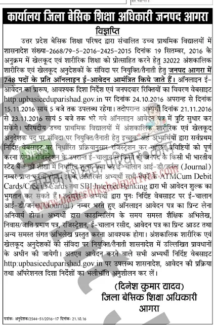 मुख्यपृष्ठअनुदेशक आगरा - अनुदेशक विज्ञप्ति : परिषदीय उच्च प्राथमिक विद्यालयों में अंशकालिक शारीरिक एवं खेलकूद अनुदेशकों के संविदा पर नियुक्ति हेतु बीएसए ने जारी की विज्ञप्ति,क्लिक कर विज्ञप्ति देखें, अक्टूबर 23, 2016