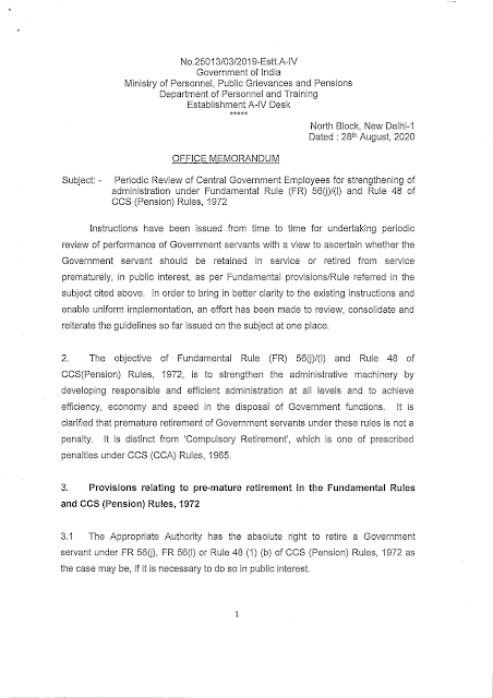 कर्मचारियों को 30-33 साल की नौकरी या 55 साल की आयु में नोटिस दिए बगैर जबरन रिटायरमेंट करने के सबन्ध में स्पष्टीकरण जारी - Permanent retirement central govt order