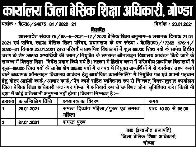 69000 शिक्षक भर्ती में विद्यालय आवंटन/नियुक्ति पत्र के सम्बन्ध में जिलावार जारी विज्ञप्तियां, लगातार अपडेट जारी,क्लिक कर देखें अपने जिले की विज्ञप्ति - Appointment Vigyapti Districtwise