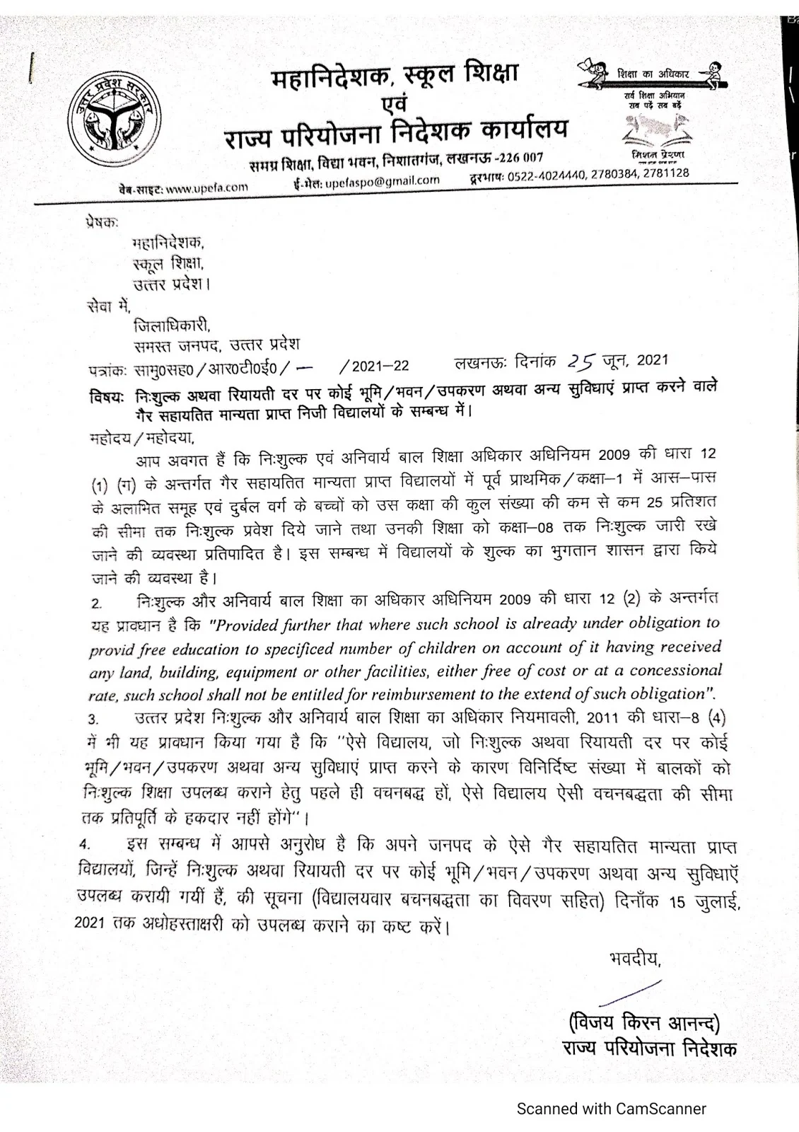 निःशुल्क अथवा रियायती दर पर कोई भूमि/भवन/उपकरण अथवा अन्य सुविधाएं प्राप्त करने वाले गैर सहायतित मान्यता प्राप्त निजी विद्यालयों की मांगी गई सूचना | Added School Related Govt order 2021