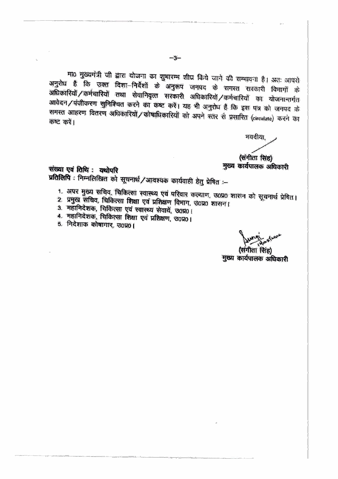 इसी प्रकार कोषाधिकारी कार्यालय में विनित सरकारी कर्मचारी/अधिकारी को भी प्रशिक्षित कर दिया जाये जिससे पेंशनरों के ऑनलाइन आवेदन प्रक्रिया को सुगम बनाया जा सके समस्त जनपदों में मुख्य चिकित्साधिकारी द्वारा विभिन्त कर्मचारियों/अधिकारियों को मास्टर ट्रेनर के रूप में प्रशिक्षित कर दिया गया है ।