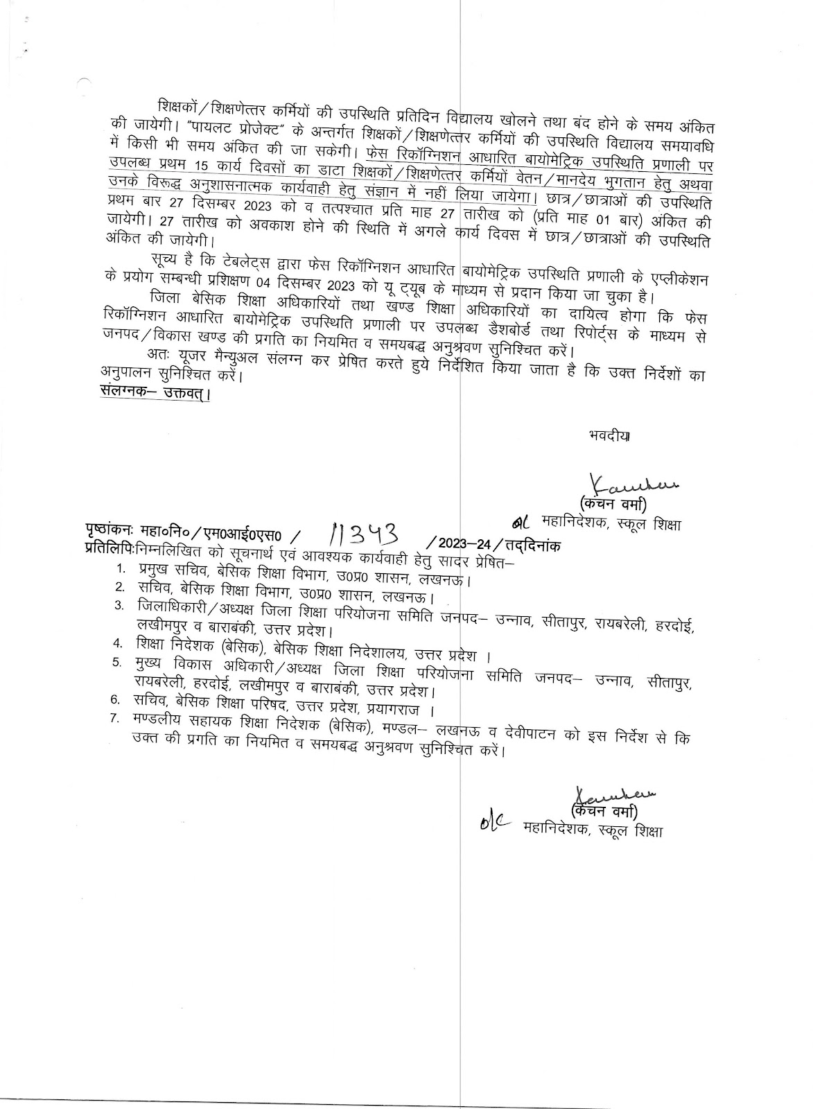 महानिदेशक कंचन वर्मा ने बेसिक विद्यालयों में फेस रिकॉग्निशन आधारित बायोमेट्रिक उपस्थिति प्रणाली लागू किये जाने के सम्बन्ध में जारी किया आदेश । Face Recognition Attendance Order 2023